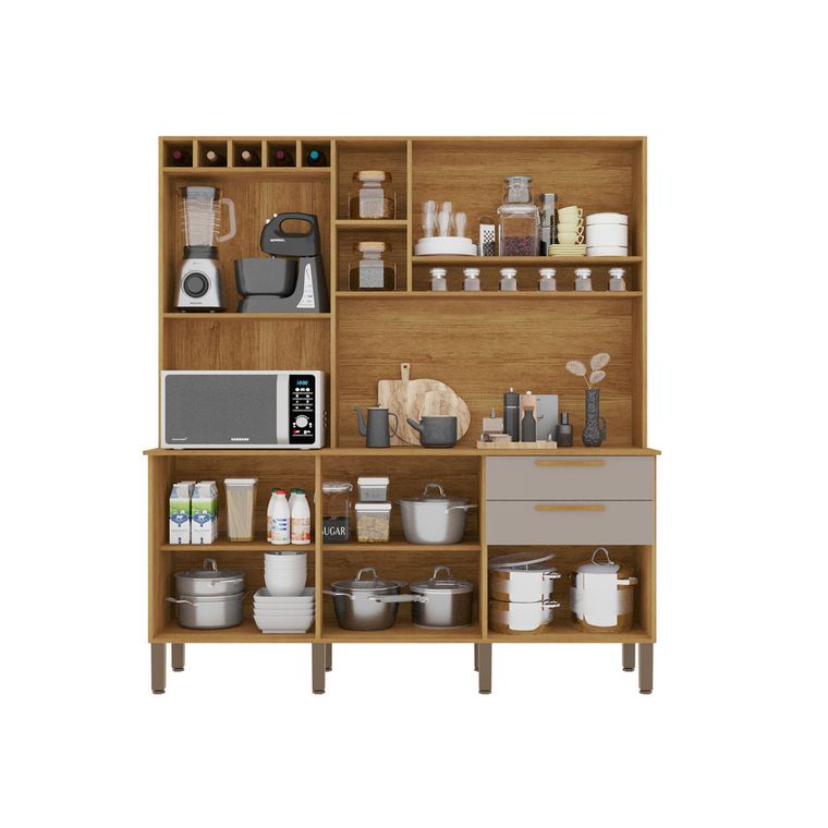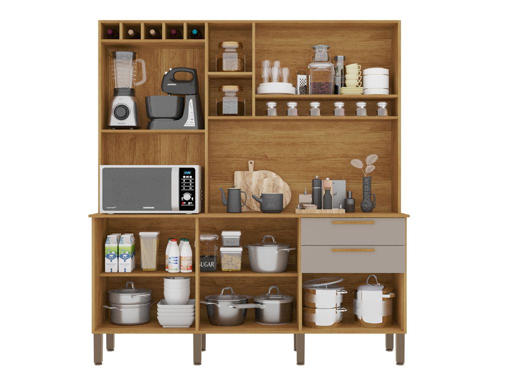 Espaço de Armazenamento: Contando com diversas prateleiras e gavetas, o Armário Salleto New Topázio oferece amplo espaço para armazenar utensílios de cozinha, alimentos e outros itens, ajudando a manter sua cozinha sempre organizada e funcional.