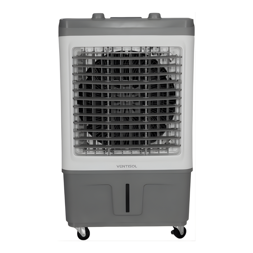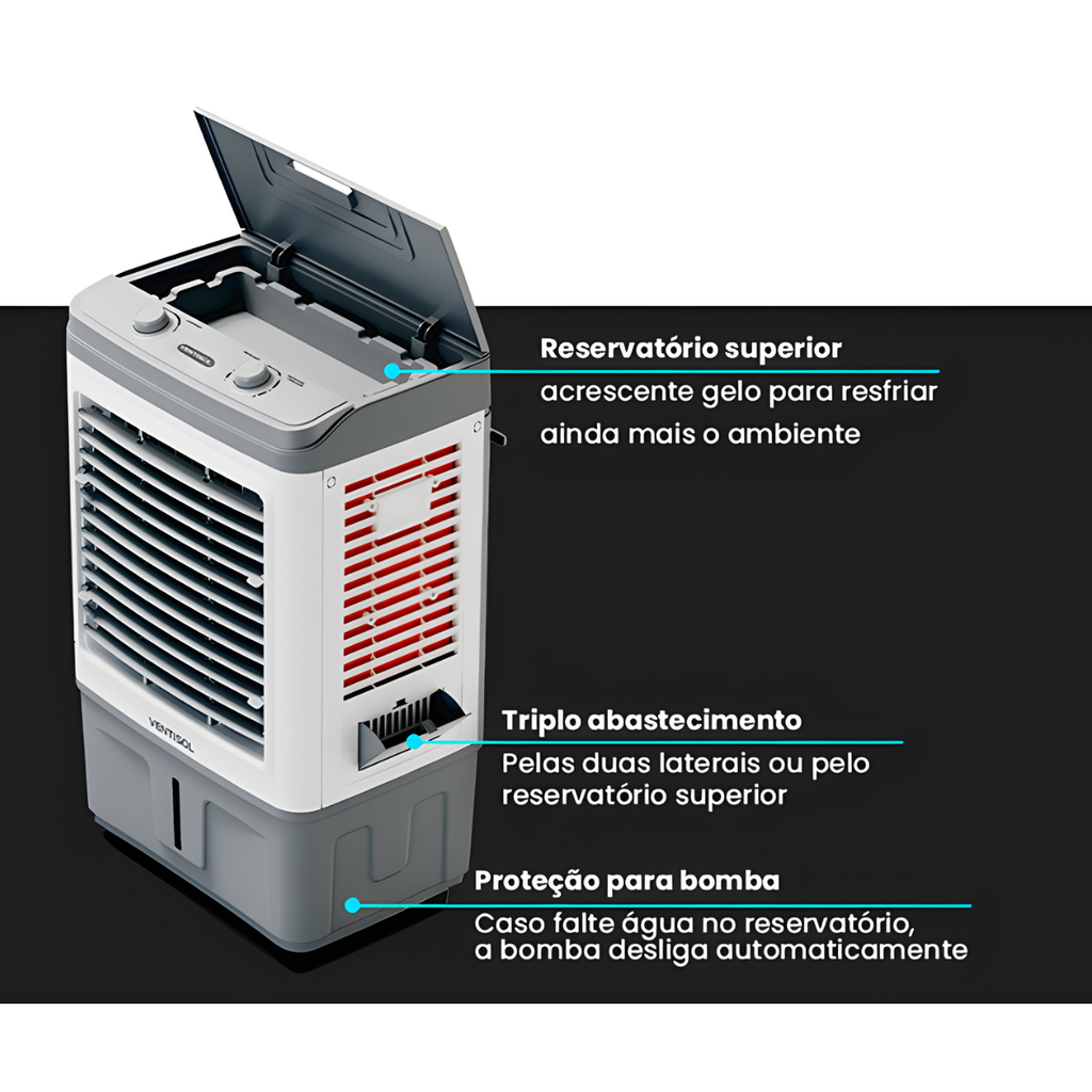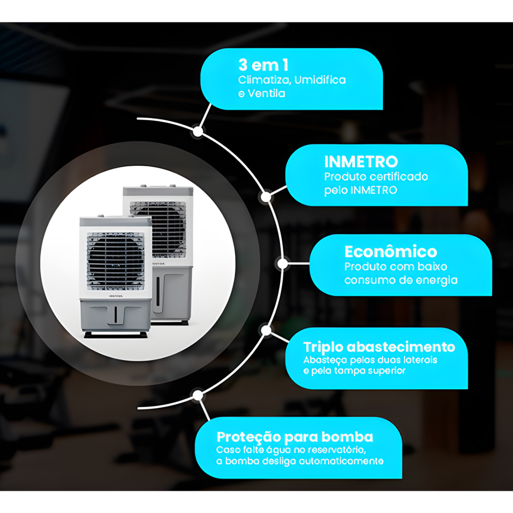 evaporativo. O design portátil com rodízios facilita o transporte entre