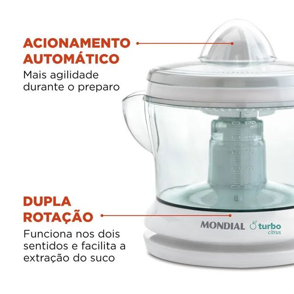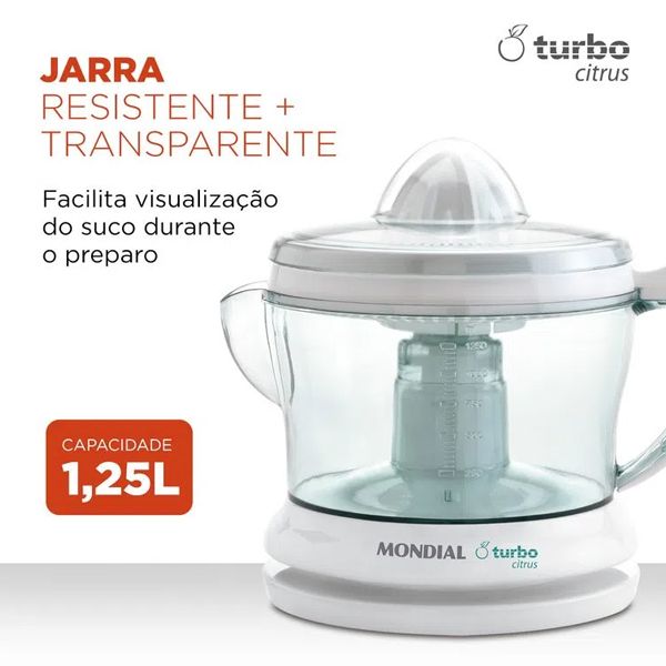 Para preparar um suco fresquinho e saudável de forma prática e rápida a qualquer hora do dia, conte com o espremedor Turbo Citrus da Mondial. Sua jarra tem capacidade para 1,25L, é transparente para facilitar a visualização e conta com . Seu cone 2 em 1 é eficiente e ágil e espreme 100% dos sucos de laranjas e cítricos, com acionamento automático e dupla rotação. A Mondial é a marca de eletrodomésticos mais vendida do Brasil e a escolha de milhões de consumidores. Sempre inovando e buscando soluções para o bem-estar das pessoas, oferece uma linha completa de produtos. Em constantes pesquisas junto aos consumidores, seu portfólio ganha destaque na qualidade, no design moderno e na excelente relação custo x benefício. A Mondial orgulha-se de ser 100% brasileira e ser eleita pelo 4º ano consecutivo uma das melhores empresas em atendimento ao consumidor pelo Reclame Aqui. Disponível nos principais pontos de venda do Brasil, oferece mais de 1.400 pontos de assistência técnica.