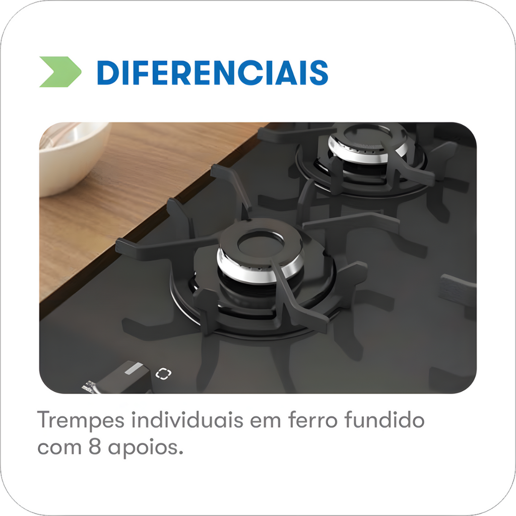 O modelo conta com 5 bocas bem distribuídas, incluindo um queimador tripla