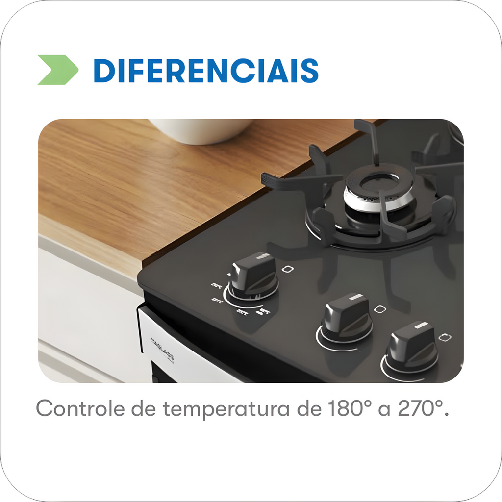 Com mesa em vidro temperado preto, o fogão oferece visual elegante e