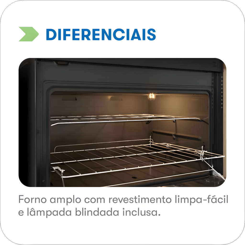 Fabricado com materiais de qualidade, o fogão apresenta acabamento interno