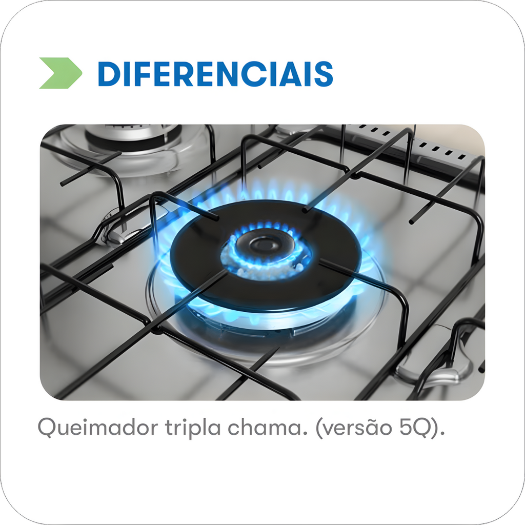 incluindo um queimador tripla chama, ideal para cozimentos mais rápidos e
