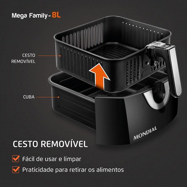 A Air Fryer Mondial Mega Family AFN-80-BI é perfeita para quem deseja preparar refeições de forma rápida e saudável, sem abrir mão do sabor. Ideal para fritar, assar, grelhar e até cozinhar diversos tipos de alimentos com praticidade e economia de óleo.