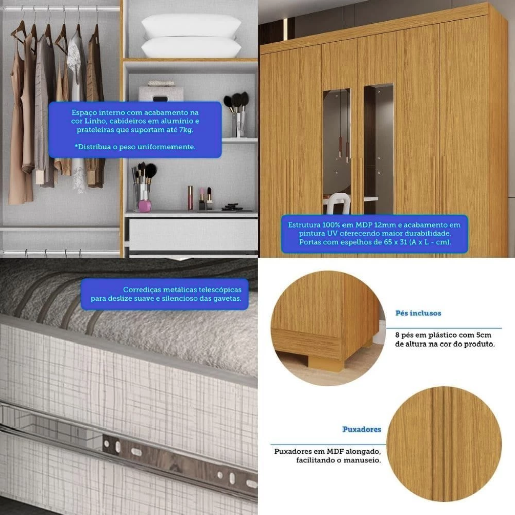 Com o Guarda-Roupas ACP Ágata 6 Portas com Espelho – Cinamomo, você garante não apenas um móvel funcional, mas também um item de destaque na decoração do quarto. Sofisticado, resistente e extremamente prático, ele é a solução ideal para quem busca organização, beleza e durabilidade em um só produto.