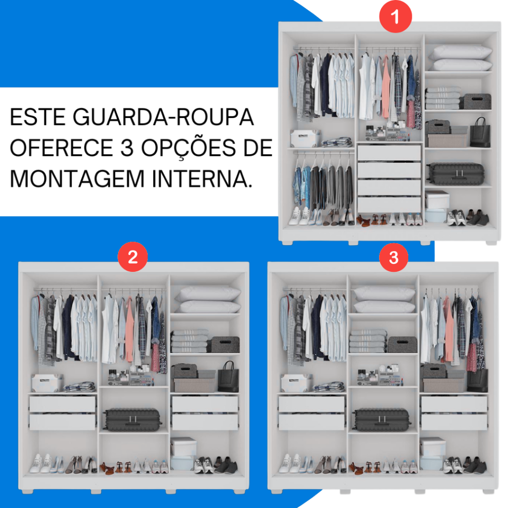 Amplo espaço interno, com divisórias bem distribuídas, incluindo prateleiras, cabideiros metálicos resistentes e nichos organizadores para roupas, acessórios e calçados.