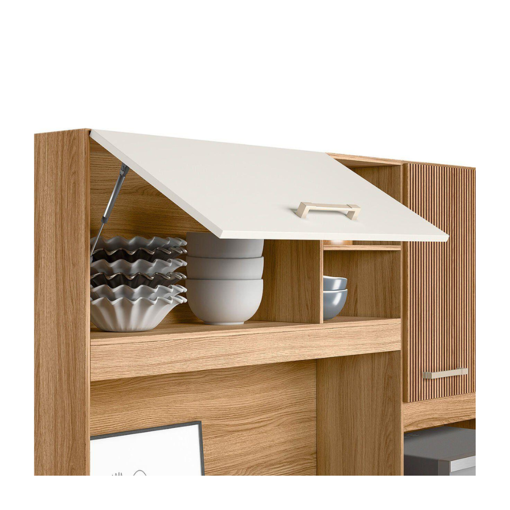 O Kit Cozinha Nicioli Yara se destaca pelo seu visual contemporâneo, combinando o tom natural do freijo com o elegante chumbo e detalhes em ripado freijo, criando uma atmosfera harmoniosa e aconchegante no ambiente.