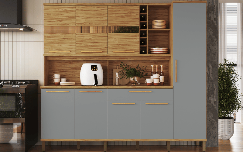 Com design moderno e linhas retas, o Kit Touriga oferece um visual clean que se adapta facilmente a diversos estilos de decoração. A cor amêndoa proporciona um toque acolhedor, enquanto o Amendoa/Cinza traz leveza e amplitude ao ambiente.