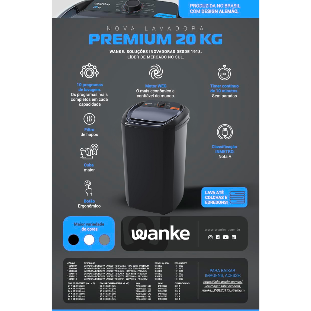 A Lavadora Semiautomática Wanke LWBE201T é uma solução prática e resistente para quem precisa lavar grandes volumes com economia e simplicidade. Com capacidade de 20.1kg, tensão 220 V / 60 Hz, acabamento cor e categoria Premium, ela foi pensada para famílias numerosas, pequenos comércios ou quem busca alta capacidade sem abrir mão de fácil operação.