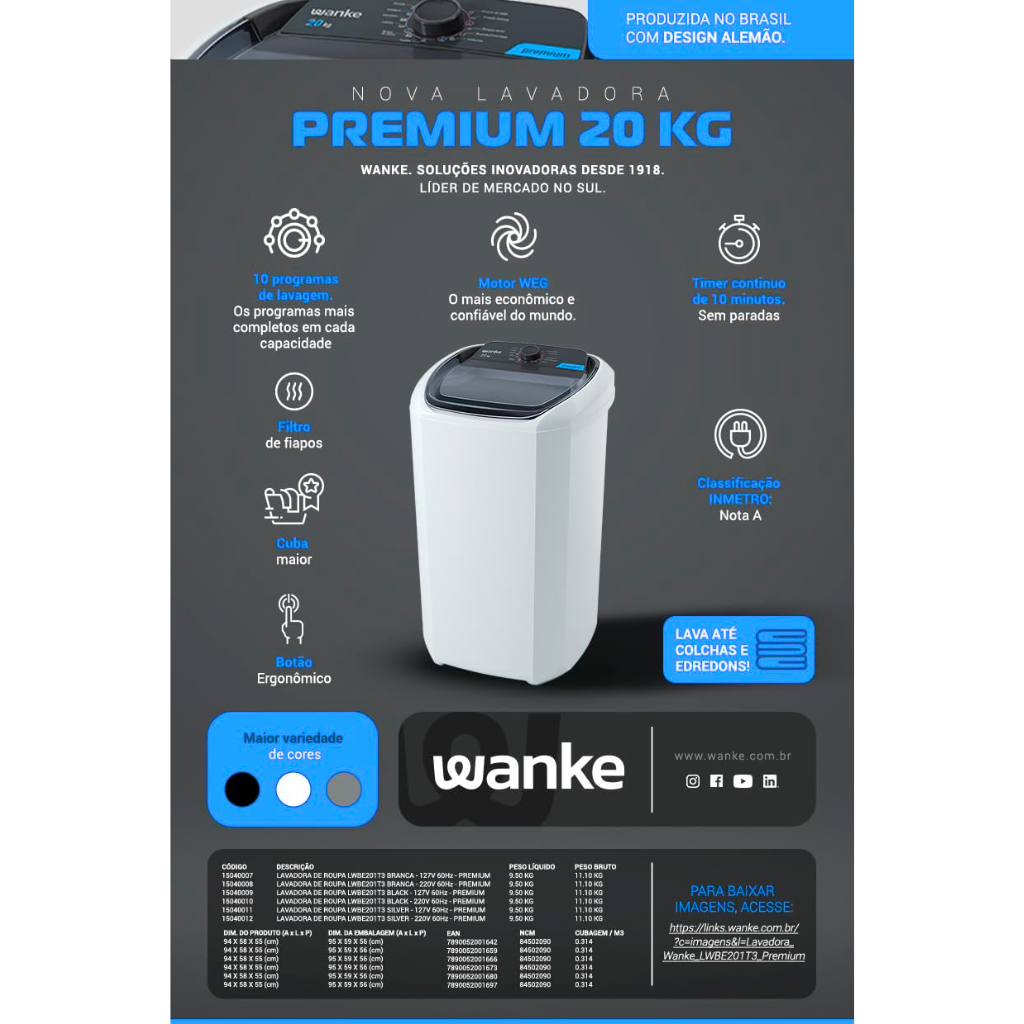 Lavadora de Roupas Wanke Semiautomática LWBE201T 20.1Kg, Cat Premium, 220V, 60hz - Branca