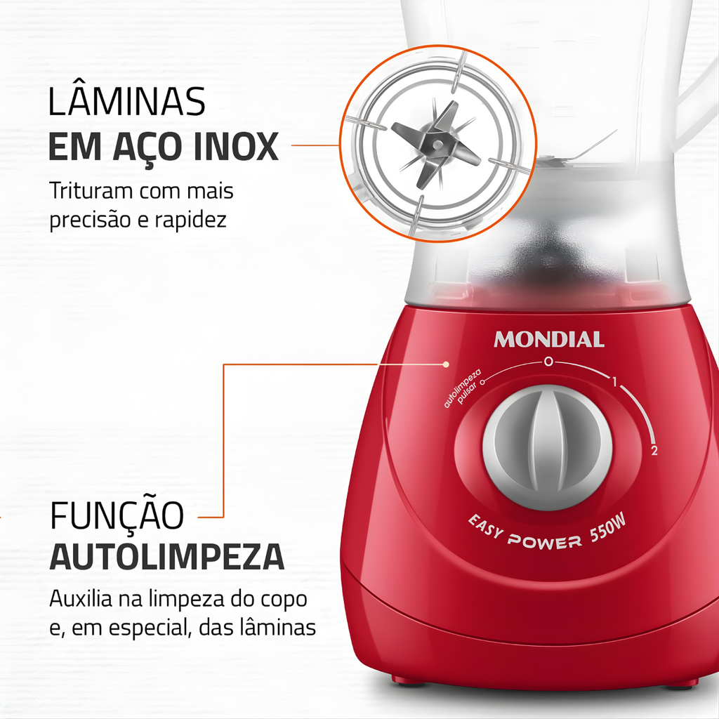 O Liquidificador Mondial L-550 com Tecnologia Easy Power é uma excelente opção para quem deseja eficiência, praticidade e bom desempenho, oferecendo potência adequada e recursos que facilitam o uso diário na cozinha.