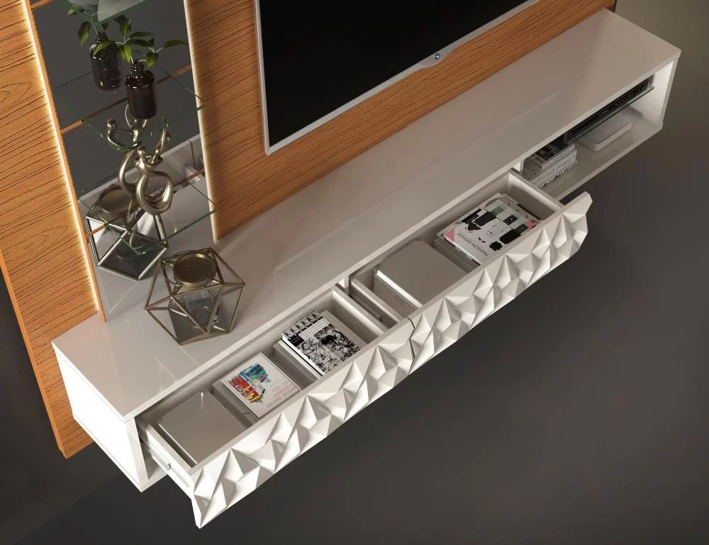 SKU 1106Informações do produto Painel Suspenso Lippi para TV 70 polegadas 100% MDF - Dj móveis O Painel Suspenso Lippi é um produto versátil e elegante, com muita sofisticação e um design que encanta. Ele possui o acabamento DIP nas suas peças de cor amadeirada, proporcionando o delicado toque da lâmina de madeira. Vale ressaltar o design 3D das frentes das gavetas, que proporcionam um destaque e chamam a atenção pela ousadia da forma, estamos falando do 3D Form um processo feito através de revestimento laminado de alta performance, através de uma nova tecnologia de produção, além disso as gavetas ajudam a organizar aqueles objetos que você precisa guardar em algum lugar de fácil acesso, e não se esqueça de que o espaço para puxar a gaveta fica em sua parte inferior. Ao lado das gavetas se encontra um nicho com uma prateleira de vidro de 8mm, onde você pode guardar seu receptor de TV, DVD ou Videogame. O painel possui um amplo espaço para TVs de até 70 polegadas, proporcionando o melhor do entretenimento para você e sua família. Ao lado do espaço para a TV, existe uma torre de espelhos com prateleiras de vidro de 8mm, o local perfeito para exibir seus objetos de decoração, destacando-os ainda mais com a iluminação das fitas de LED (Opcional) que ficam nas laterais da torre de espelhos. Por ser um móvel suspenso, ele proporciona espaço no chão para facilitar a limpeza além de proporcionar um local para outros objetos decorativos ou pufes. Com tantos atributos e um design tão arrojado, o Painel Suspenso Lippi é a escolha certa se você quer requinte e qualidade na sua sala de estar. Deixe seu ambiente mais luxuoso e confortável com este belo produto. Dimensões e Atributos Largura produto montado: 215 cm Altura produto montado: 165 cm Profundidade produto montado: 34 cm Peso do produto sem embalagem: 92,45kg Material da estrutura: MDF Material das portas: Não possui Material das prateleiras: MDF Acabamento das bordas: PVC e Melamina Material do fundo: MDF Material do Tampo: MDF Quantidade de portas: Não possui Possui porta de correr: Não possui Quantidade de prateleiras: 4 (Vidro incolor comum de 8mm de espessura) Quantidade de nichos: 1 Quantidade de gavetas: 2 Acompanha suporte para TV: Não Possui furação para passagem de cabos: Sim. Os fios ficam mais organizados e escondidos Possui vidro: Sim, vidro incolor comum de 8mm. Produto extensível: Não Possui opção de montagem inversa: Não Possui rodízios: Não Possui sapatas para proteger contra umidade do piso: Não é necessário, o produto já é suspenso. Necessita fixação na parede: Sim Sistema de Montagem: Minifix, cavilhas e parafusos Led: Kit LED Capacidade Ideal para TVs de até: 70" Espaço para TVs medindo até (LxAxP): 164x120 cm Espaço para aparelhos tipo DVD medindo até (LxAxP): 1 espaço medindo: 45x12,5x25,5cm 1 espaço medindo: 62x13,5x30 cm Peso máximo que suporta: 50Kg painel Informações complementares Cor Avelã Marca DJ Material da Estrutura MDF Polegadas da TV 70"