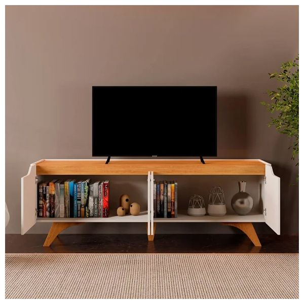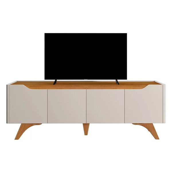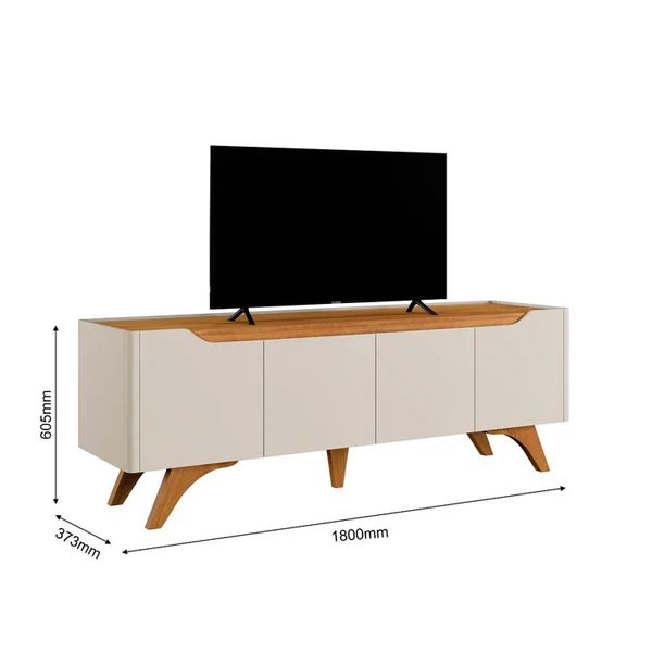 Rack Mavaular Atenas 4 Portas 1,80M - Off White/Naturalle conta com design clean e sofisticado com cantos arredondados em MDF, quatro portas com dobradiças de 35mm slow motion e batente de silicone com fechamento silencioso, para melhor durabilidade do seu móvel, Possui também uma prateleira interna e pés de madeira maciça.