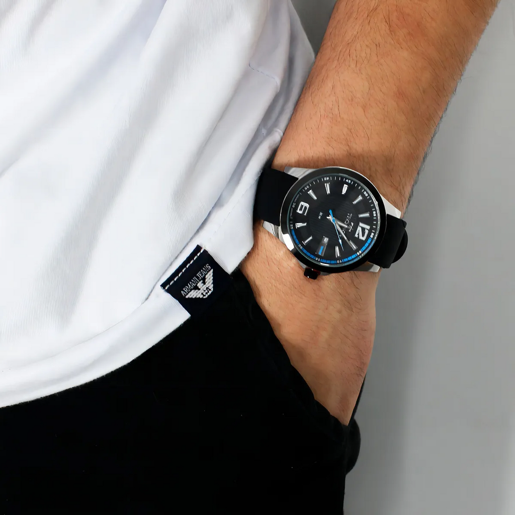 instrumentos automotivos. A pulseira em silicone preto oferece conforto,