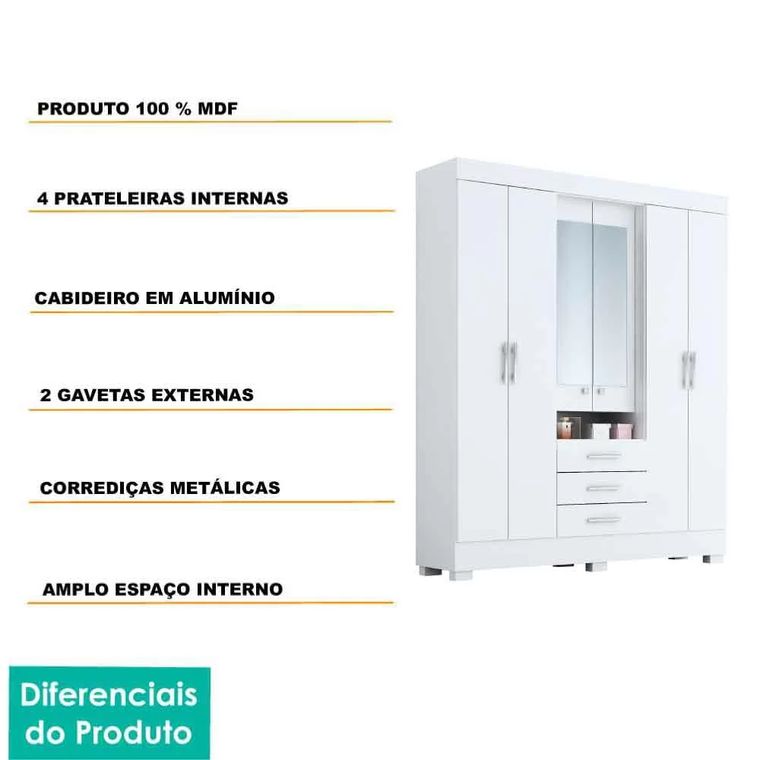 Guarda Roupas/Roupeiro Acp Agata 6 Portas Mdp Com Espelho - Branco