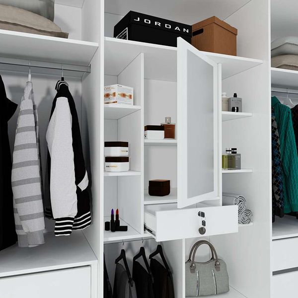 Material O Guarda-Roupa Madrid é composto por MDF 15mm, espelho temperado 5mm, 6 portas com dobradiças em metal, puxadores de PVC, 7 gavetas com corrediças telescópicas, 16 nichos, cabideiro em alumínio e acabamento fosco.