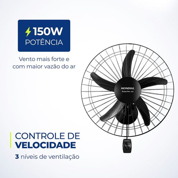 Potência e Eficiência: O ventilador conta com uma potência de 50W,